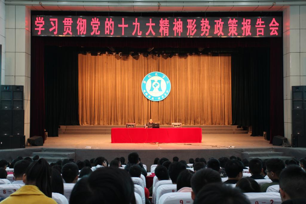 12月22日下午,党委书记肖立军在会堂为800余名师生作题为《新时代、新思想、新未来》的学习贯彻党的十九大精神形势政策报告。