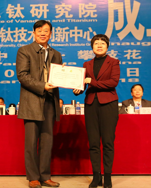 干勇为钒钛学院授牌,余艾冰为研究院授牌,中国钢研集团党委委员、副总经理李波和我校党委副书记、校长王曙光共同为创新中心授牌。