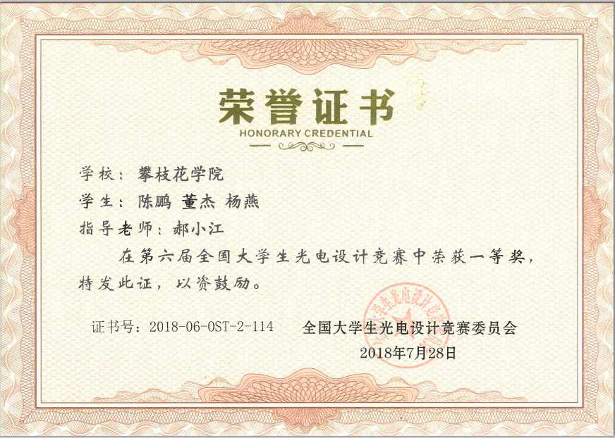 727-28日,第六届全国大学生光电设计竞赛在北京理工大学举行,经过单车排位赛和双车对抗淘汰赛及竞赛答辩环节,我校组成的“飞梦队”(2017级自动化董杰、2016级自动化陈鹏、杨燕)勇夺全国一等奖,这也是四川省唯一的一个一等奖,郝小江老师获得优秀指导教师奖。