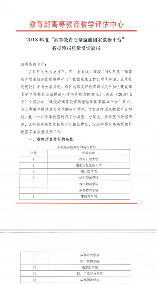 近日,从教育部高等教育教学评估中心发布的“2018年度高等教育质量监测国家数据平台数据填报质量反馈简报”获悉,我校位列四川省“数据质量较好高校名单”(排名不分先后),全省共有12所本科高校获此殊荣。