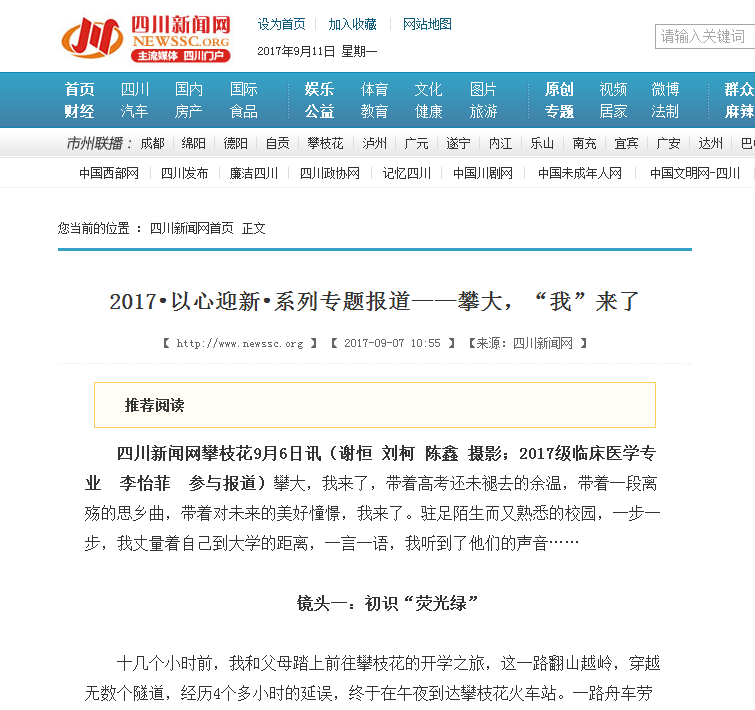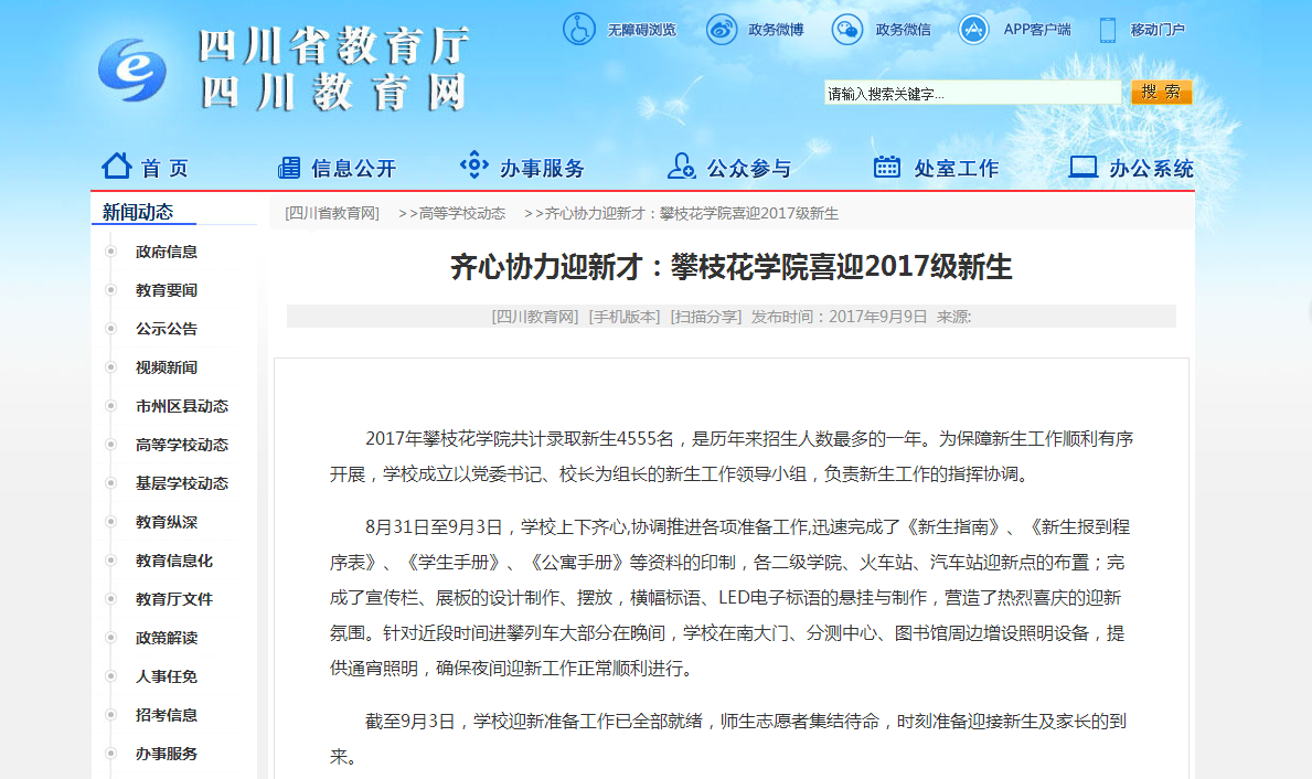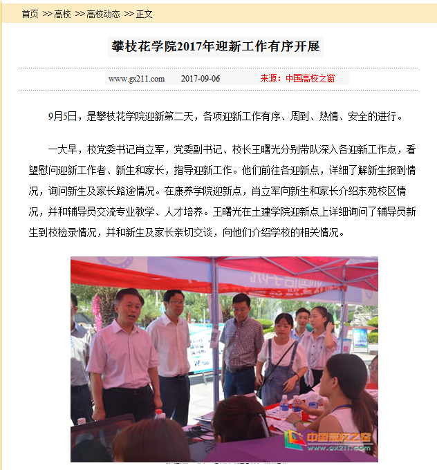为及时、集中、快速报道学校迎新情况,学校传媒中心通过校园新闻网、官方微信、广播电视以及“一直播”网络直播等平台开展了“2017•以心迎新”系列报道,消息受省市媒体关注。四川新闻网、四川省教育厅四川教育网和中国高校之窗等网络平台相继转发报道了我校迎新工作;《攀枝花日报》分别于9月6日、8日报道我校迎新、开学典礼等情况,攀枝花市电视台于9月5日对我校康养学院迎新情况进行了专题报道。