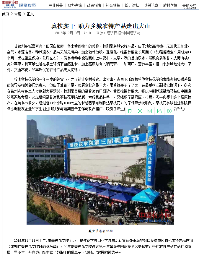 1210日,《中国经济网》以“真扶实干 助力乡城农特产品走出大山”为题,对我校助力乡城县脱贫,开展对口扶贫单位有机农特产品展销会工作进行专题报道。