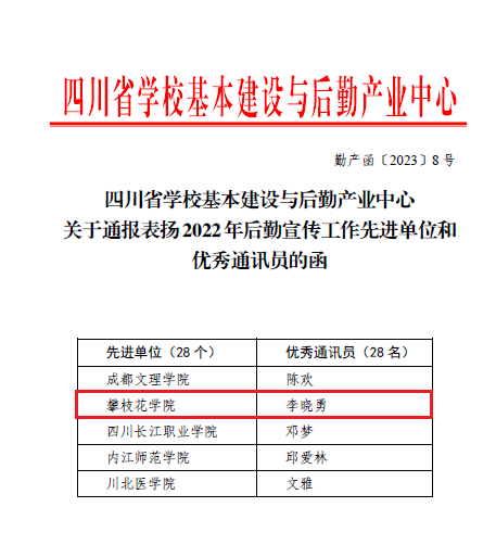 近日,四川省学校基本建设与后勤产业中心通报表扬了2022年后勤宣传工作先进单位和优秀通讯员,我校被授予“先进单位”荣誉称号,后勤处李晓勇同志荣获“优秀通讯员”称号。