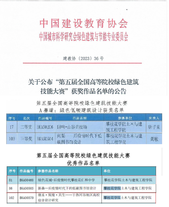 其中,2019级建筑学学生唐子童团队的设计作品《回响•山谷竞技场》被评为全国二等奖,2020级城规学生龚敏团队《问渠——后疫情时代下低碳图书馆设计》被评为全国三等奖。《绿色花城-后疫情时代攀枝花仁和中学》、《新森-后疫情时代下的低碳图书馆设计》、《继承·筑境·共生——干热河谷地区高校宿舍设计研究》三个设计作品获优秀奖。