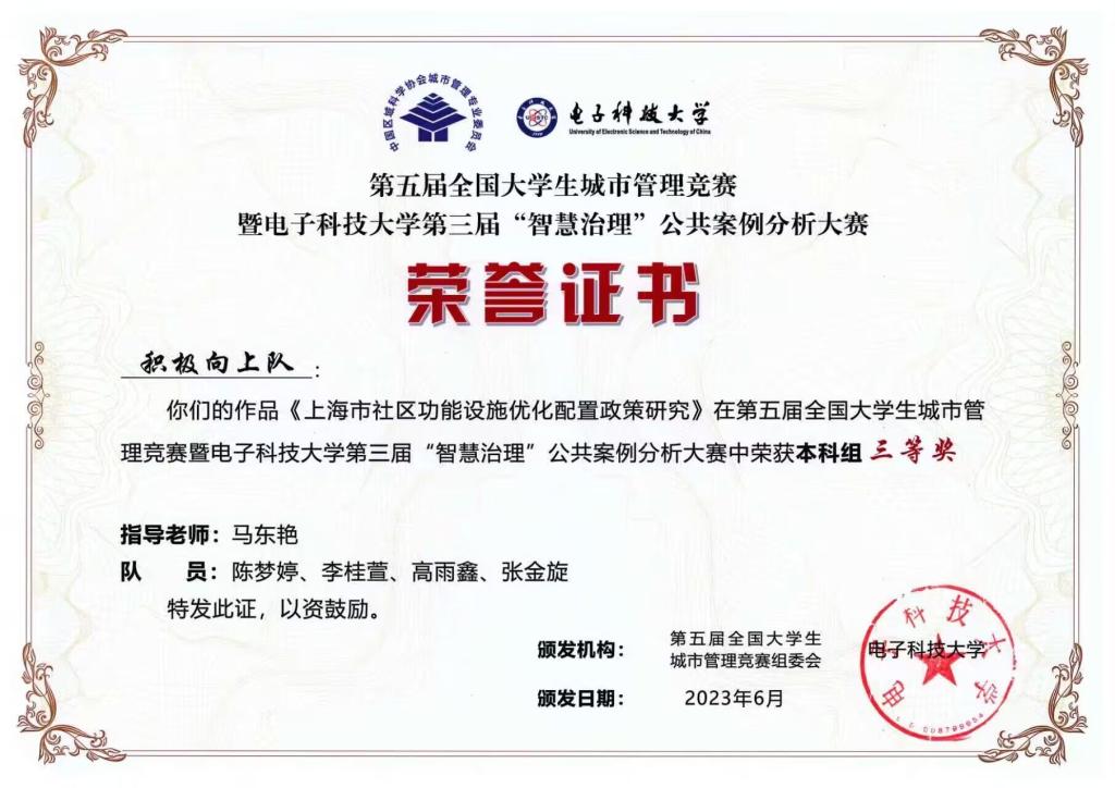 近日,由教育部全国城市管理专业教学指导委员、中国区域科学协会城市管理专业委员会主办,电子科技大学承办的第五届全国大学生城市管理竞赛暨电子科技大学第三届“智慧治理”公共案例分析大赛评审结束。我校法学院马东艳老师带领行政管理专业队伍参加比赛,并荣获本科组三等奖3项。