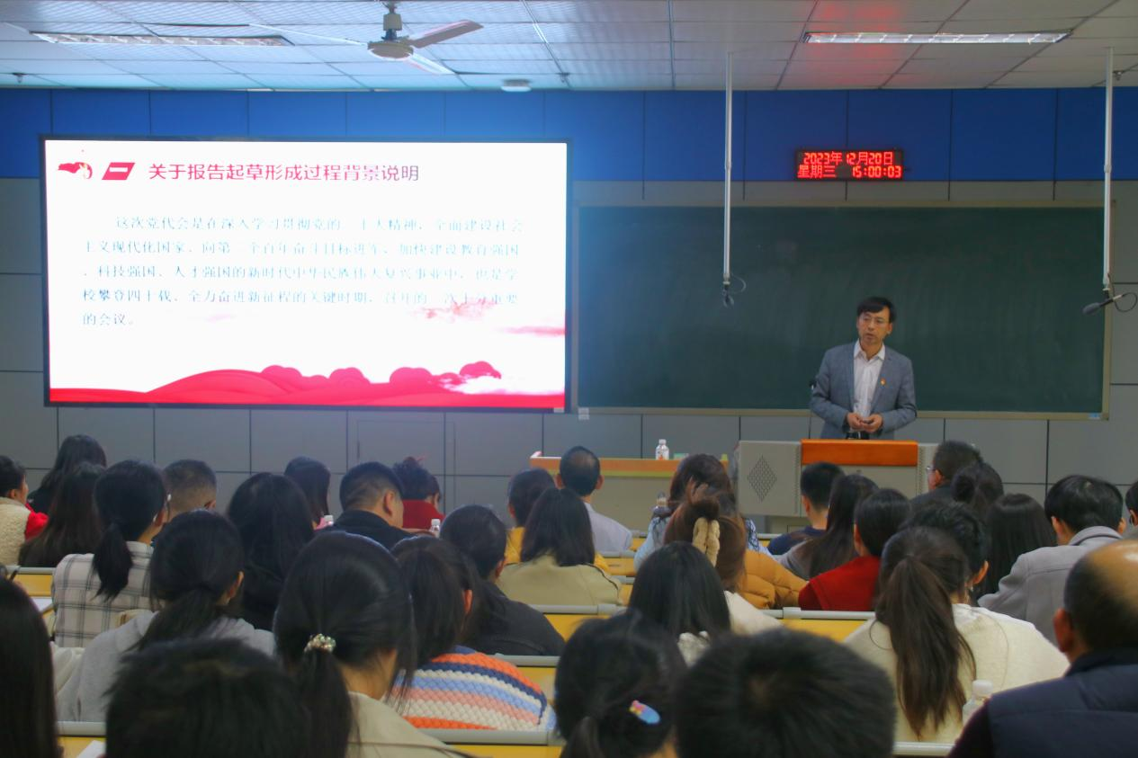 李东从报告起草形成过程总体结构报告的主题内涵,以及深刻认识、准确把握新时代以来和过去五年的奋斗历程未来五年的建设总要求今后五年学校的重点工作等六个方面对报告内容进行了清晰的脉络梳理和深刻的剖析讲解。带领师生共同回顾了学校建校四十年来所取得的成绩,展望了未来五年学校建设总要求和今后五年的重点工作,用“35399”数字化剖析了第三次党代会报告的整体思路。