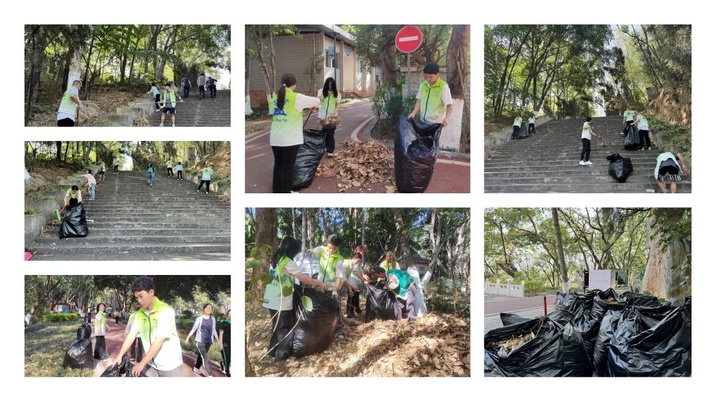 纪念活动后,全体师生在纪念碑周边开展了清扫活动。大家按照公园绿化师傅的指导,做好清扫分工,分别对道路两边山坡落叶进行清扫、收集、清运,为公园营造了干净整洁的游览环境。