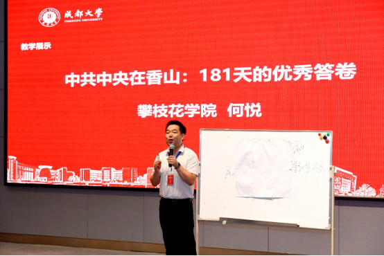 教学展示环节中,来自绵阳师范学院、西南财经大学、成都理工大学、西南财经大学天府学院、攀枝花学院、西南交通大学等6所本科的老师分别进行教学展示,我校何悦老师以“中共中央在香山——181天的优秀答卷”为题进行展示,坚持内容为王,论从史出、史论结合,获得专家和老师们的一致好评,荣获特等奖!