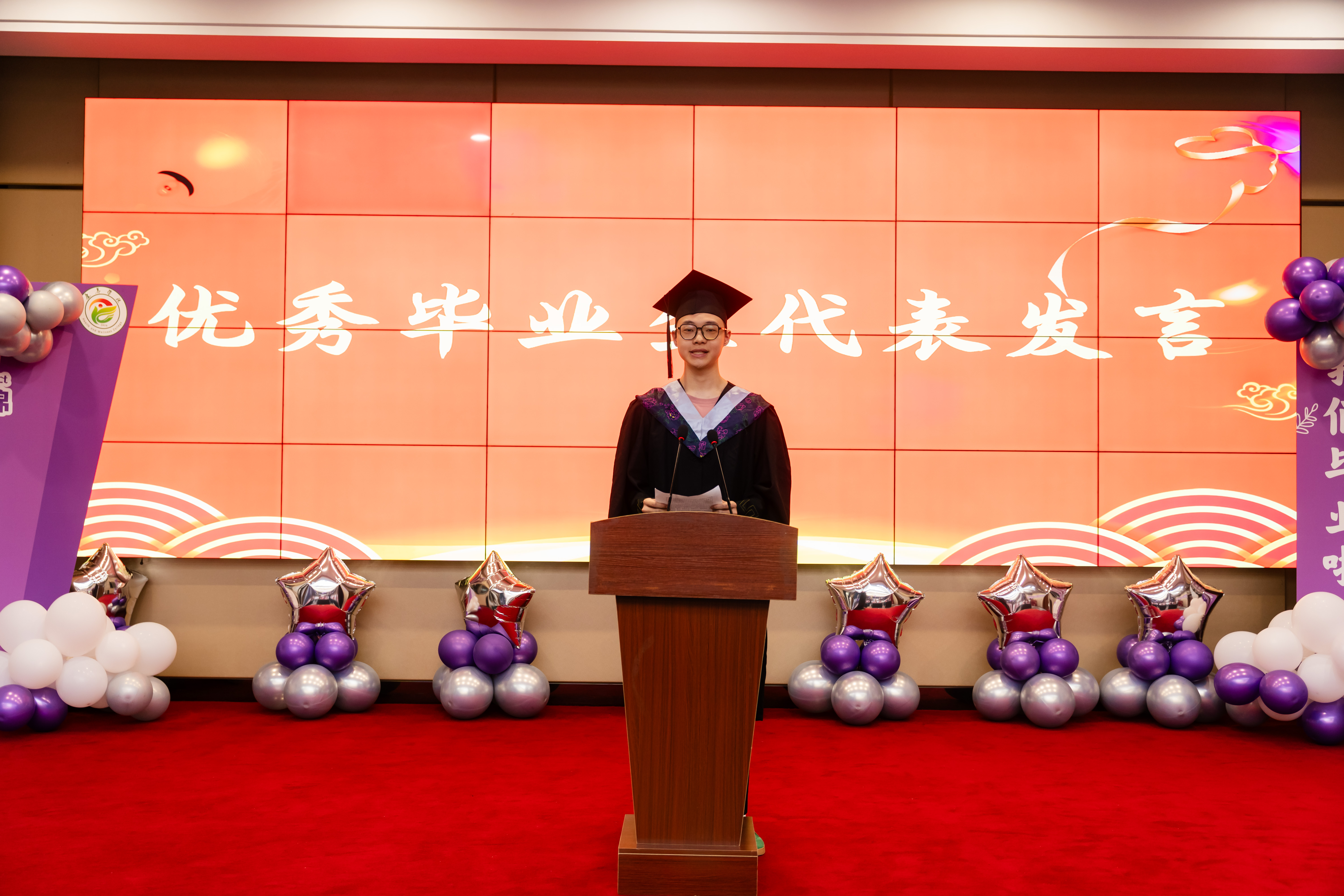 优秀毕业生代表郭渝川上台分享了他的成长故事。从专业课程学习中的攻克难关,到实习实践里的收获成长,郭渝川用亲身经历传递着奋进的力量,激励着在场的每一位同学。他代表2025届毕业生衷心感谢师长们的一路相伴与悉心指导。