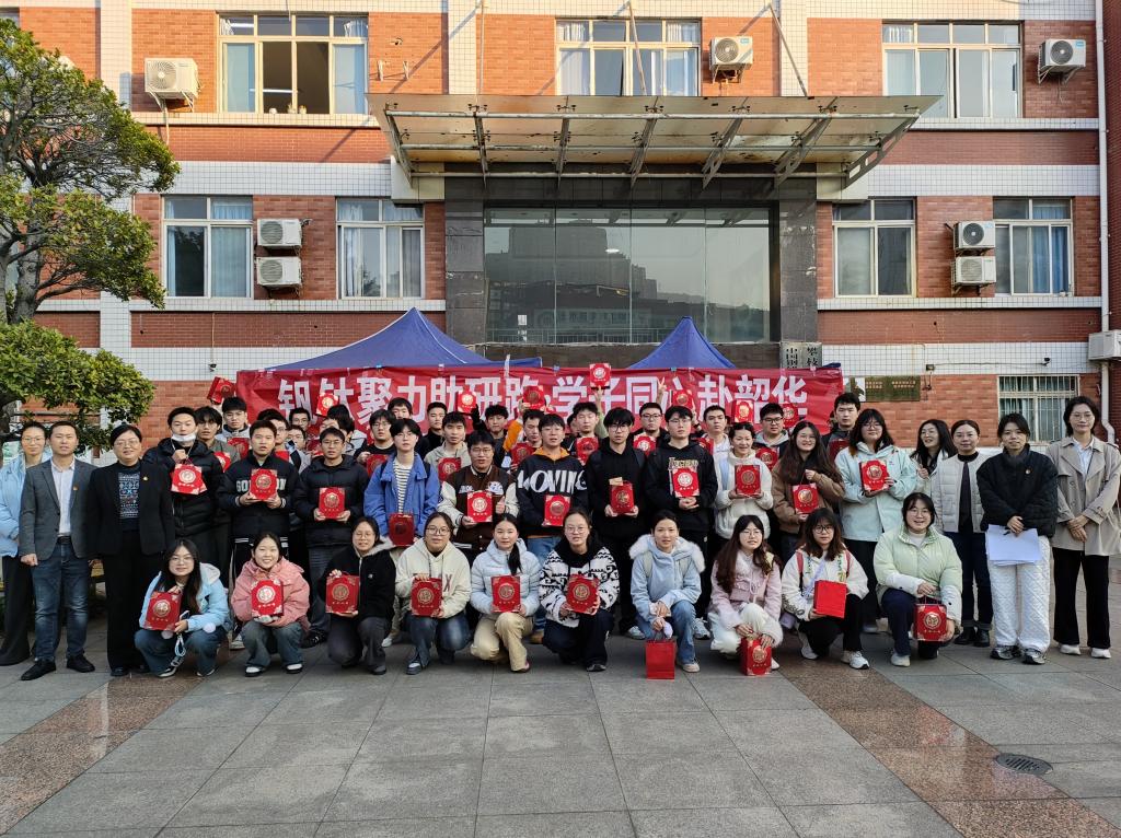 致辞结束后,师生互动环节温情开启。学院领导与辅导员亲手将“考研暖心加油包”逐一分发到学子手中。据悉,加油包内不仅配有能量补给食品,更附有满载学院叮咛与祝福的暖心寄语,每一处细节均凝聚着学院对学子“笔下生辉、心想事成”的美好期许。